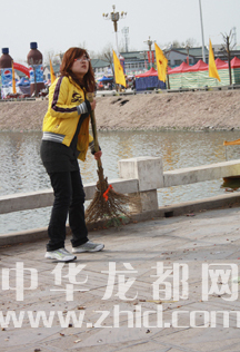 2010年4月2日,我在淮陽太昊陵廟會(huì)上,拍到了一個(gè)女孩與環(huán)衛(wèi)工人一起勞動(dòng)的畫面,她不是專業(yè)的環(huán)衛(wèi)工人,但卻做起了太昊陵的“美容師”。