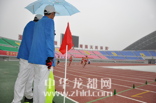 ??? 本網(wǎng)訊 11月22日下午,市二運會田徑賽場上徑賽項目冒雨進行。雨中,氣溫降至5攝氏度左右,觀眾也寥寥無幾。但是,我們的運動員和裁判仍然認真的進行著比賽。