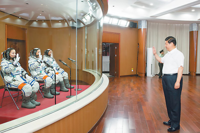 ?。保比罩形?,習近平在酒泉衛(wèi)星發(fā)射中心聽取了天宮一號與神舟十號載人飛行任務有關情況匯報。習近平充分肯定各參研參試單位和部門為完成神舟十號載人航天飛行任務所做的大量準備工作。習近平說,這次任務飛行時間長,試驗難度大,面臨一系列新的挑戰(zhàn)和考驗。希望同志們牢記使命、堅定信心、周密組織、科學實施,確保實現(xiàn)既定的任務目標,努力奪取載人航天事業(yè)發(fā)展新勝利。