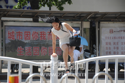 七一路上,一位妙齡少女不顧個(gè)人形象翻越護(hù)欄。