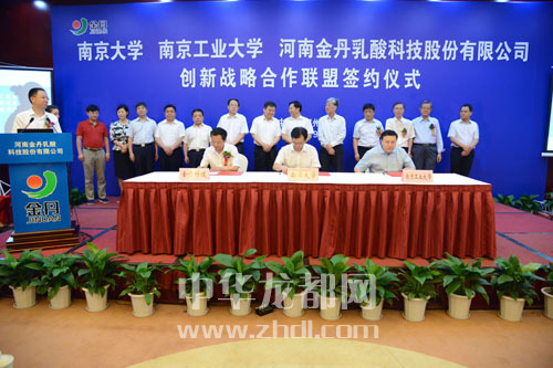 ????本報(bào)訊(記者 李莉) 7月9日上午,南京大學(xué)、南京工業(yè)大學(xué)、河南金丹乳酸科技股份有限公司創(chuàng)新戰(zhàn)略合作聯(lián)盟簽約儀式在鄭州舉行。副省長張維寧,中國工程院院士張全興,南京大學(xué)副校長談?wù)苊?,南京工業(yè)大學(xué)副校長喬旭,省科技廳廳長張震宇,市委書記、市人大常委會主任徐光,省環(huán)保廳副廳長師偉,市委常委、常務(wù)副市長劉保倉,市委常委、組織部長靳磊,副市長王田業(yè),及鄲城縣主要領(lǐng)導(dǎo)、河南金丹乳酸公司主要負(fù)責(zé)人出席簽約儀式。