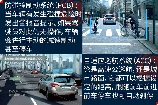EyeSight駕駛輔助系統(tǒng)是避免事故發(fā)生,此次在中國市場亮相是它的第三代產(chǎn)品,其主要亮點是通過兩個模擬人眼的立體攝像頭,來監(jiān)控距離車輛前方100米以內(nèi),高度在1米以上的人、車輛和物體,以減少傷害為目的的駕駛輔助系統(tǒng);除了距離以外,還可以對方向、高度大小等指標(biāo)進行識別。它的主要功能分為四大類,分別是防碰撞制動系統(tǒng)(PCB)、車速自適應(yīng)巡航控制系統(tǒng)(ACC)、起步油門誤操作預(yù)防系統(tǒng)和警報與提示系統(tǒng)。