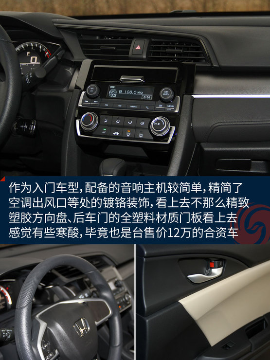 十代思域的內(nèi)飾精干又很有層次感,1.0T車型只是在用料上簡化了些,空調(diào)出風(fēng)口等處去掉了鍍鉻裝飾,看起來有點(diǎn)素。帶大屏幕的娛樂系統(tǒng)自然不會(huì)保留,換上的音響主機(jī)聽音樂、藍(lán)牙免提這些基本功能還是齊備的,不過車內(nèi)音響系統(tǒng)就只有兩個(gè)前門上各有一個(gè)的喇叭了。