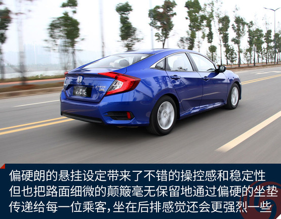 思域的定位一直偏向運(yùn)動(dòng),這一代車型自然不會(huì)放棄這一特色,底盤的扎實(shí)感、懸掛偏硬朗的設(shè)定都營造了同級(jí)別里相對(duì)出色的操控感受。不過懸掛系統(tǒng)在韌性方面相對(duì)薄弱,路感太強(qiáng)烈,鋪裝路面上細(xì)微的不平整所帶來的振動(dòng)也比較清晰地傳遞到車內(nèi)。座椅的靠背包裹感還不錯(cuò),填充也比較得體,很舒服,但坐墊偏硬,因此行駛中車輛整體對(duì)振動(dòng)的抑制能力欠佳,很大程度上影響了舒適性。