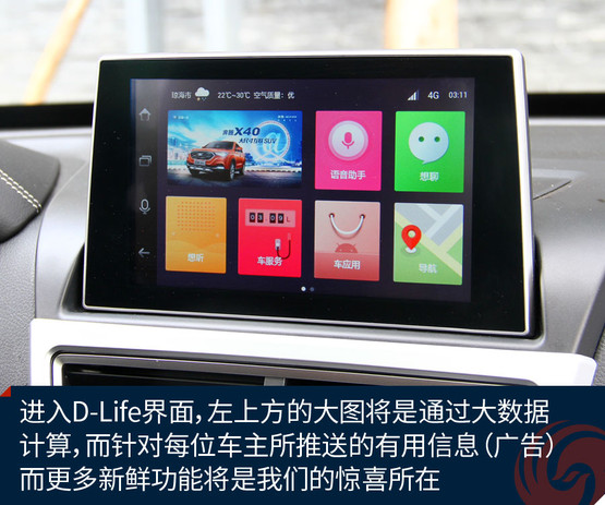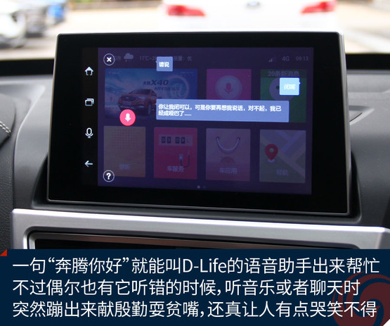 不過跟奔騰X40接觸兩天之后,會發(fā)現(xiàn)它大可不必在對手林立的市場中血拼顏值,靠實力不俗的獨(dú)門絕技一樣能夠輕松獲得一席之地。既然面向年輕用戶,豐富的車載娛樂系統(tǒng)很關(guān)鍵。大屏幕、手機(jī)互聯(lián)等等似乎已經(jīng)是這類車的標(biāo)配。奔騰X40更進(jìn)一步,所搭載的D-Life系統(tǒng)讓我們看到了它引領(lǐng)潮流的勁頭。
