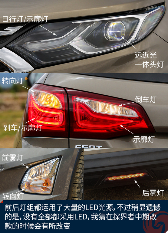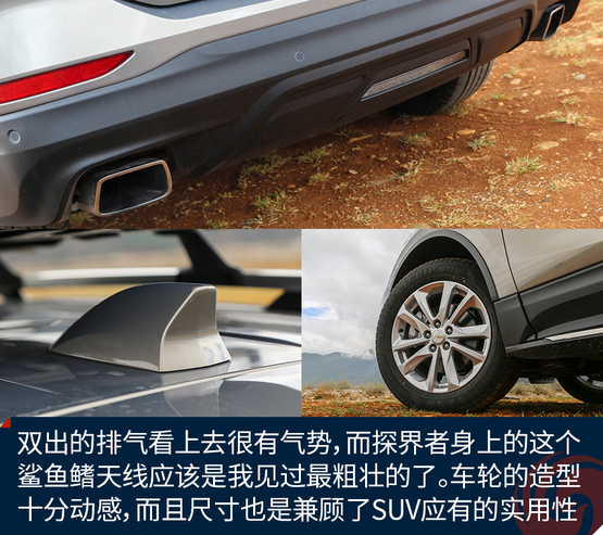 外觀上令我印象深刻的地方有這么幾個(gè),首先前后燈組都運(yùn)用了大量的LED光源,不過(guò)稍顯遺憾的是,沒(méi)有全部都采用LED,我猜在探界者中期改款的時(shí)候會(huì)有所改變。四個(gè)車門下部包邊的設(shè)計(jì)能夠減少下車弄臟褲腿時(shí)的尷尬。車頂?shù)男欣罴苷娴目捎?,而且?jù)說(shuō)早期購(gòu)買探界者的朋友還能獲得車頂?shù)男欣钕?,十分?shí)用。雙出的排氣看上去很有氣勢(shì),而探界者身上的這個(gè)鯊魚鰭天線應(yīng)該是我見過(guò)最粗壯的了。車輪的造型十分動(dòng)感,而且尺寸也是兼顧了SUV應(yīng)有的實(shí)用性。