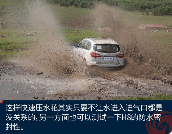 ????????涉水測試對于新哈弗H8來說簡直是小菜一碟,190mm的離地間隙,500mm的最大涉水高度,這條小河完全阻擋不了H8的腳步。俗話說“緊走沙,慢走水”是對于路況不清楚的水域,萬一進氣系統(tǒng)進水,發(fā)動機就會熄火。所以一定要小心涉水深度。像我們這么莽撞的壓水花,是在水域已經(jīng)探明的情況下。