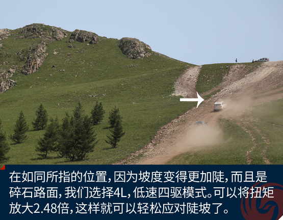 ????????經(jīng)過刺激的涉水越野,我們終于來到了此行最難的挑戰(zhàn)地,傳奇大坡。這條上山的土路從圖片上看起來不陡,實際上已經(jīng)達到了45%的坡度。人爬起來都氣喘吁吁。而且難度大的原因是兩點,一個是超長距離的大上坡,另一個是后端是碎石路面。你想靠沖坡根本行不通,如果動力不足最終是無法登頂?shù)?。H8不僅動力充沛而且有4L,低速四驅(qū)模式,而且博格華納雙速TOD可以隨時分配動力傳遞到前后軸,保障了有抓地力的輪胎有驅(qū)動力。