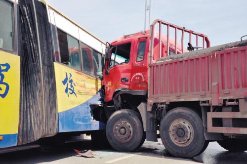 ????????昨日12時(shí)許,記者趕到事發(fā)地點(diǎn):渾南西路與沈蘇西路交會(huì)處的渾河站橋。只見一輛紅色車身的運(yùn)水罐車與一輛藍(lán)黃相間的大客車相撞!