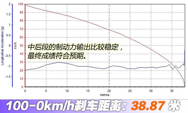 ????全力制動(dòng)時(shí)車身有點(diǎn)頭的現(xiàn)象,但車身總體保持穩(wěn)定,最終成績(jī)?yōu)?8.87米,表現(xiàn)符合預(yù)期。這個(gè)成績(jī)?cè)谄囍业脑u(píng)價(jià)體系中,也屬于優(yōu)秀水平。