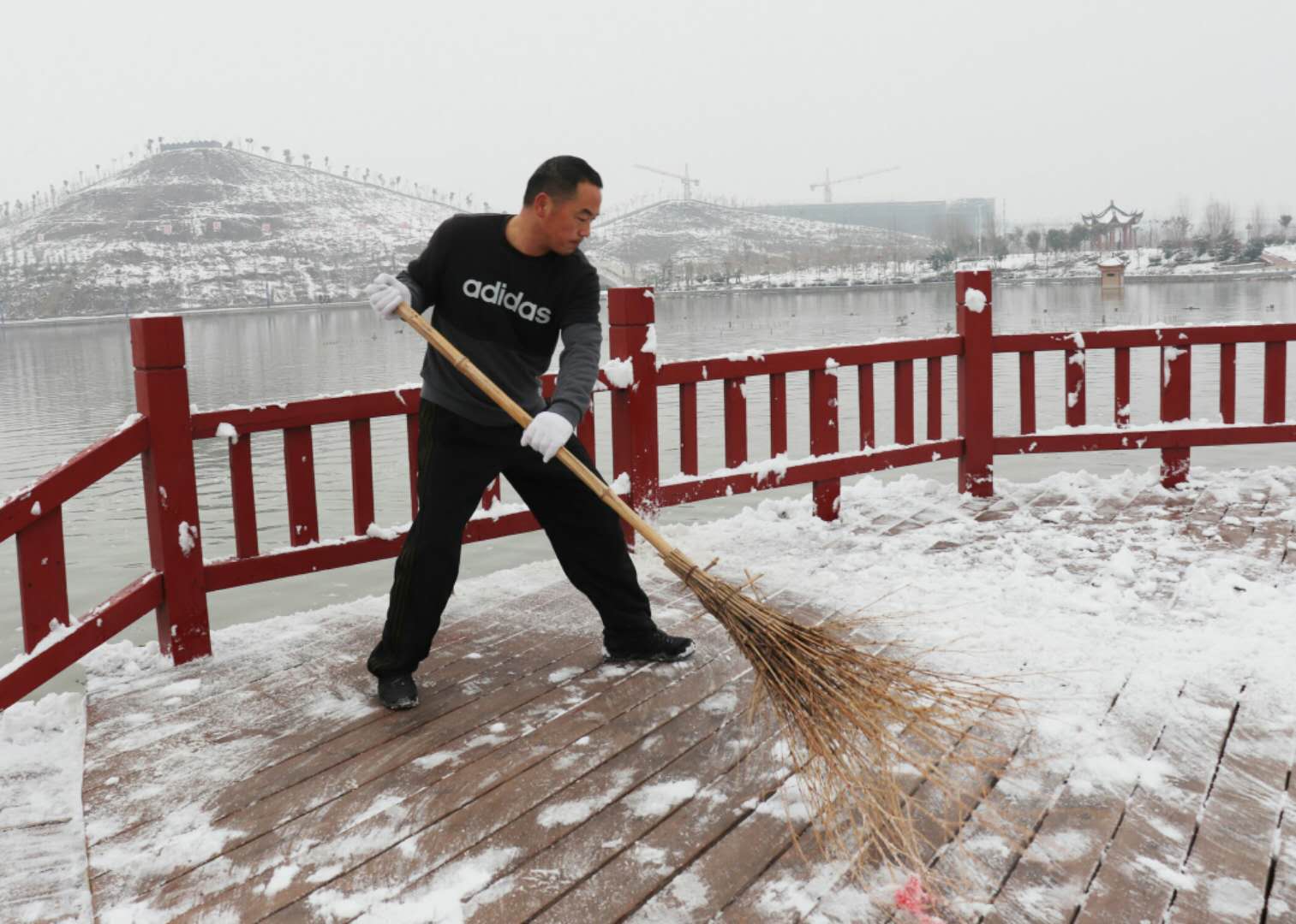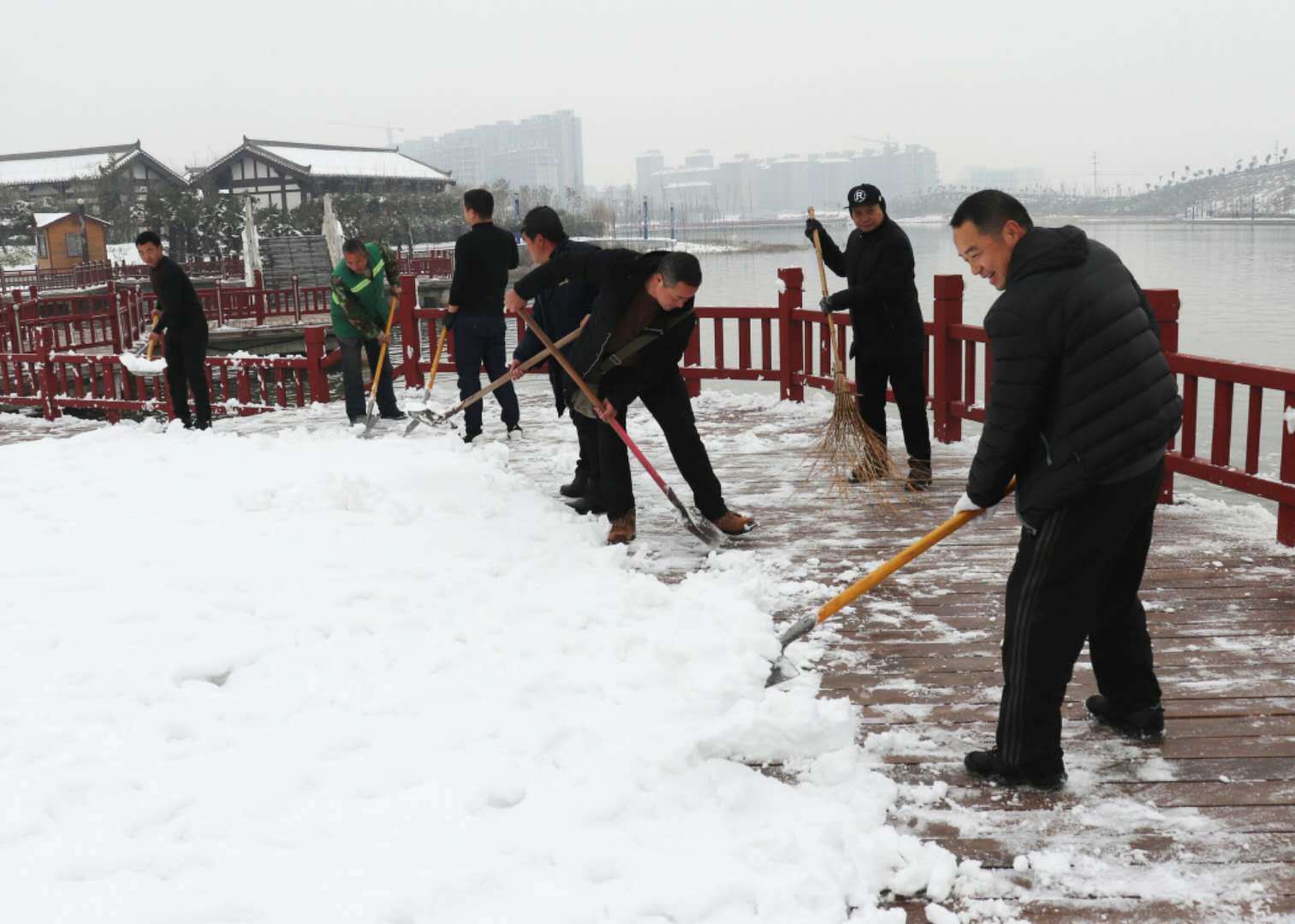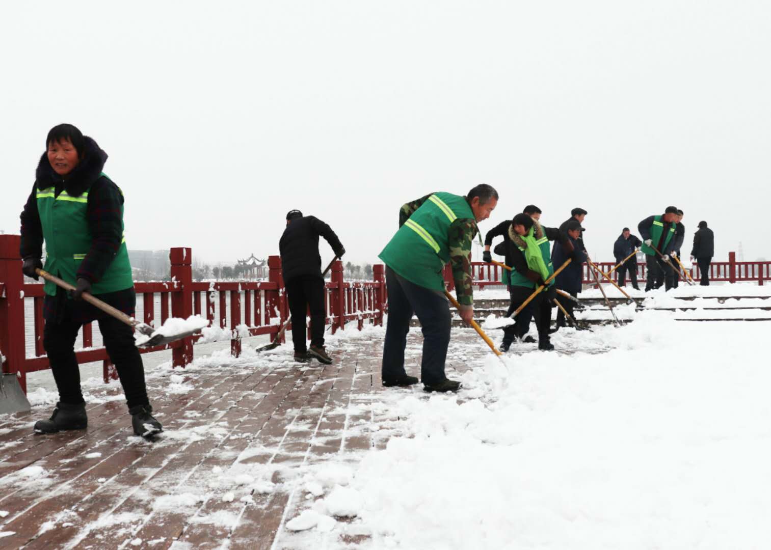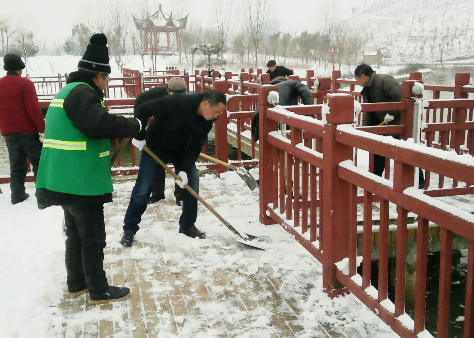 經(jīng)過兩場大雪的洗禮,空氣格外清新,但鹿邑上清湖公園內(nèi)積雪嚴重,且已結(jié)冰,給市民游園帶來了諸多不便和隱患。從早晨到下午4點半,鹿邑市政園林中心的干部職工和道德公益志愿者在上清湖集合后,投入鏟雪掃雪行動,經(jīng)過一天的緊張清掃,上清湖湖面棧道和園內(nèi)公路上的積雪清掃一遍。道德公益志愿者鐘華在微信群里提出建議后,有十幾位志愿者報名參加上清湖義務掃雪活動。