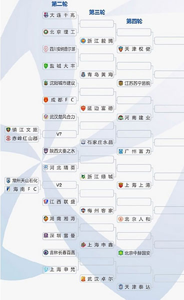第四輪開(kāi)始16支中超球隊(duì)加入角逐,加上從第三輪晉級(jí)的16支球隊(duì),共32支球隊(duì)參賽,中超球隊(duì)自動(dòng)落位相應(yīng)客場(chǎng)簽位,其中廣州恒大、上海申花、上海上港和天津權(quán)健4支亞冠球隊(duì)將分別落位在A、B、C、D區(qū),這4支球隊(duì)在半決賽之前不會(huì)相遇。