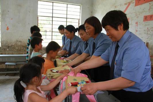 該院2013年成立了“檢察官媽媽”愛心服務(wù)隊(duì),與貧困家庭結(jié)成對(duì)子,一對(duì)一的幫扶,為貧困的留守兒童解決生活、學(xué)習(xí)上的實(shí)際困難。每年的“六 一”兒童節(jié)、中秋節(jié)、春節(jié)期間慰問貧困兒童,給他們帶去學(xué)習(xí)用具、衣物為他們表演自編自演的節(jié)目。女檢察官們用女性特有的細(xì)心、耐心和愛心,不但在物質(zhì)上給予幫助,在心靈上給予關(guān)懷,讓他們?cè)陉?yáng)光下健康快樂的成長(zhǎng)。