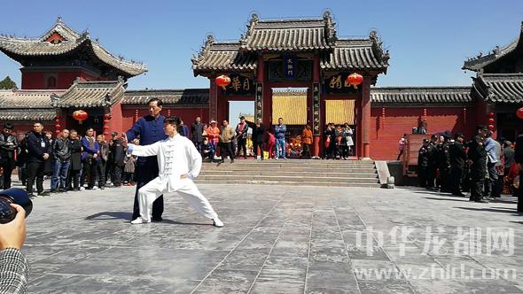 研討會(huì)前,王西安大師率弟子在淮陽太昊陵廟太極門前向海內(nèi)外太極拳愛好者傳授拳術(shù)。