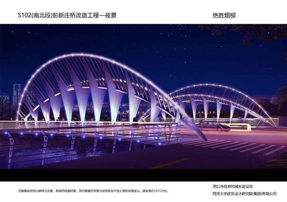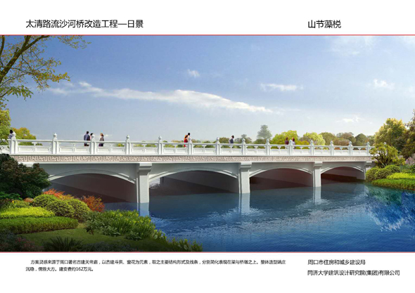 周口大道沙潁河橋景觀改造,設(shè)計(jì)造型簡(jiǎn)單柔美,如行云流水,同時(shí)與沙潁河景觀帶相融合,給城市增添了生機(jī)與活力。周口大道賈東干渠橋以荷葉為設(shè)計(jì)元素,造型簡(jiǎn)約而不失細(xì)節(jié)。周口大道流沙河橋造型簡(jiǎn)潔大氣,線條流暢,像一條青龍游弋在水面上。文昌大道幸福河橋以花瓣、葉子為設(shè)計(jì)元素,造型豐富多彩。文昌大道流沙河故道橋在中分帶位置修建花壇,花壇造型莊重古樸,景石造型端莊沉穩(wěn)。太清路流沙河橋以古建斗拱、窗花為元素,造型儒雅大方。太清路洼沖溝2號(hào)橋以“輻轂相依”為名,既融合環(huán)境,又有團(tuán)結(jié)、合作的寓意。太清路賈魯河橋,增加了景觀造型,使人們可以重溫當(dāng)年賈魯河的美好畫卷。彭新莊橋以柳葉為元素,預(yù)示著留住賓客與送別親友的不舍之情的雙重含義。
