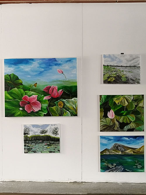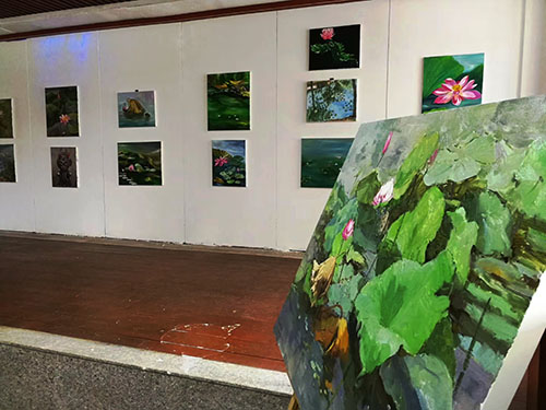 在龍湖荷花盛開的季節(jié),女詩人油畫家三色堇、娜仁琪琪格、愛斐兒、暖玉、白芳芳、劉文文一行6人,來到周口進(jìn)行寫生觀摩,開展老莊文化交流、伏羲太極文化傳播等公益活動。7月17日上午開展女詩人油畫家寫生作品展,豐富多樣的活動成為淮陽荷花節(jié)一濃墨重彩的一筆。