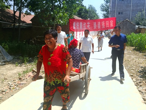 這不,老人的思想工作剛一做通。按照安排好的議程:老太太為三個兒媳婦戴上大紅花,三個兒媳婦主動搬家,村干部舉著“媳婦戴紅花,婆婆接回家”的條幅,熱熱鬧鬧地把兩位老人接回了三兒子家居住。全村許多群眾前來圍觀、拍手叫好,為村里其他家族做了榜樣。