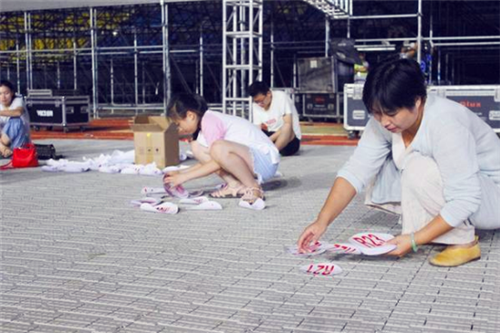 圖③:幾名工作人員正在地上整理號(hào)碼貼。