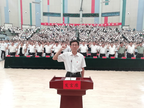 “不忘初心、牢記使命………爭分奪秒、苦干實(shí)干,堅(jiān)決打贏脫貧攻堅(jiān)戰(zhàn)!”隨著縣委書記馬明超領(lǐng)誓,與會的約4000名干部集體莊嚴(yán)宣誓??h委副書記、縣長王毅主持大會。