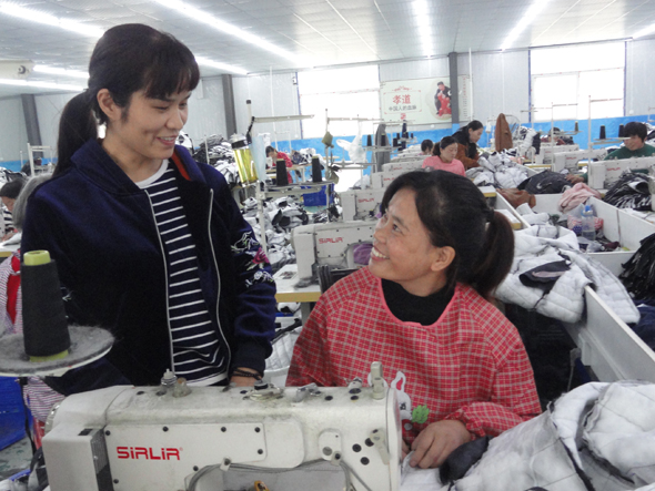 10月20日,商水縣黃寨鎮(zhèn)草樓村“返鄉(xiāng)創(chuàng)業(yè)標兵”、鎮(zhèn)人大代表梁艷麗(左)向留守婦女李霞了解生產情況。5年前,梁艷麗和丈夫田新田從溫州打工返鄉(xiāng)后在鎮(zhèn)人大、工商聯(lián)和扶貧辦的幫助下投資200萬元創(chuàng)建巧姑制衣有限公司,下設3個制衣廠和1個扶貧車間,安排當?shù)?00多名留守婦女和30名貧困戶婦女就業(yè)。