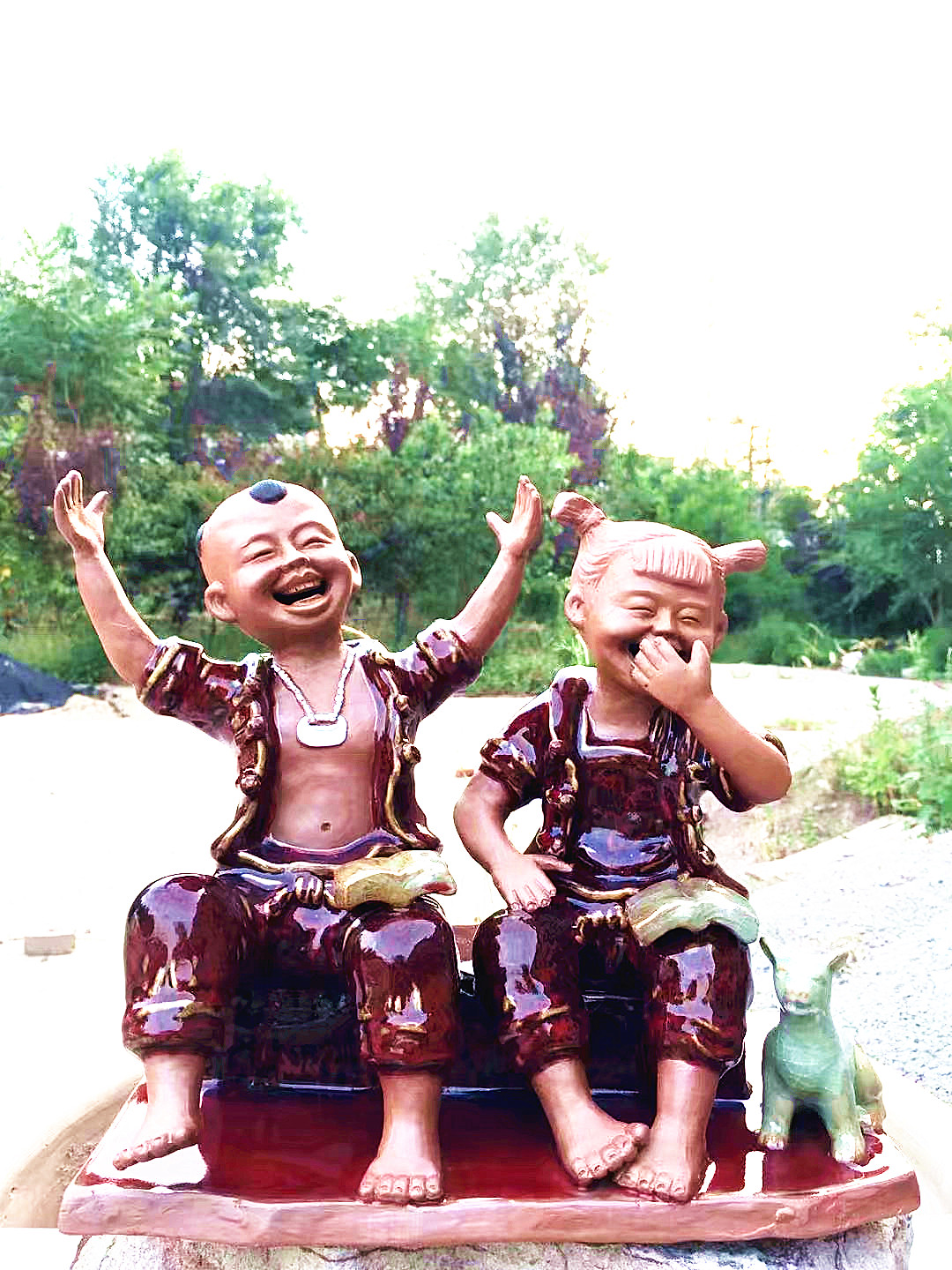 記者采訪獲悉,張振福鈞瓷泥塑作品《童話故事》,表現(xiàn)的是豫東農(nóng)村的孩子看書的情景,畫面中小男孩講述書中的童話故事,手舞足蹈,逗得小女孩開懷大笑,表現(xiàn)童真、童趣,畫面充滿著喜慶祥和,從側(cè)面反映了豫東人民的幸福生活。作品長(zhǎng)39厘米、寬23厘米高36厘米,是張振福把泥塑和鈞瓷完美結(jié)合、使用鈞瓷礦泥,泥塑局部上釉,更具觀賞性。