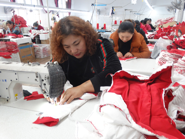 11月11日,沈丘縣周營(yíng)鎮(zhèn)慧恩服飾來(lái)料加工點(diǎn),當(dāng)?shù)厥畮酌羰亍扒上眿D”正忙著加工訂單兒童冬季服裝。