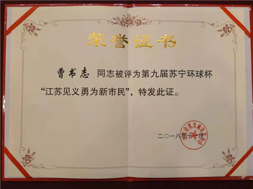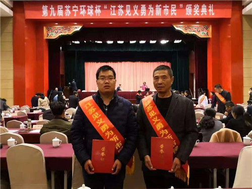 11月14日,江蘇省見義勇為基金會第九屆蘇寧環(huán)球杯“江蘇見義勇為新市民”頒獎典禮在南京舉行,來自河南省項城市新橋鎮(zhèn)的農民工曹書志獲此殊榮。