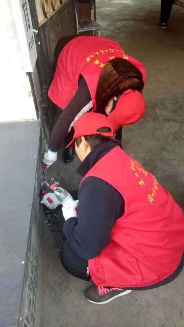 為了加快清理的速度,有的志愿者兩兩搭班,一個(gè)人用瓶裝水噴在小廣告處,另一個(gè)則趕忙用抹布進(jìn)行擦拭。別小瞧這些小廣告,清理起來(lái)很費(fèi)時(shí)、費(fèi)力,有時(shí)候一個(gè)小廣告需要花費(fèi)五、六分鐘的時(shí)間才能清理干凈,讓人累的手臂酸麻。