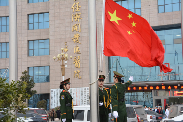 2月10日,正月初六,年后開工的好日子。在嚴格的“禁放令”下,周口城區(qū)沒有了“開門炮”的喧囂,卻有著更有意義的慶祝方式。圖為周口協和骨科醫(yī)院隆重舉行升國旗儀式,全面啟動節(jié)后工作,并祝愿祖國新年好運。 記者 李偉 攝