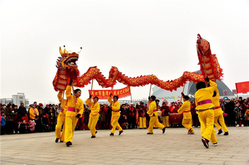 展演現(xiàn)場,人頭攢動,鑼鼓喧囂,16名身穿金黃、亮藍衣服的舞龍隊員率先登場,金燦燦的巨龍時而甩尾前行,時而昂首盤踞,浩浩蕩蕩;8只舞獅歡騰雀躍、活靈活現(xiàn);精美的裝飾的旱船穿行其中,老生、老旦扮相的隊員邊走邊唱;整齊劃一的腰鼓隊以及隊形優(yōu)美的擔經挑把現(xiàn)場氣氛推向高潮……持續(xù)近2小時的展演活動中,精彩的民俗表演令人目不暇接,為這座城市增添了濃濃的年味。
