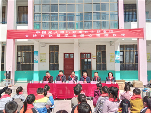 3月14日上午,陽光明媚,春意盎然。中國光大銀行鄭州鄭汴路支行向商水縣湯莊鄉(xiāng)趙橋學校愛心捐贈儀式在趙橋學校內舉行。河南省委組織部駐西趙橋村第一書記楊永,商水縣教體局負責人鄭春來、湯莊鄉(xiāng)黨委書記潘建甫等出席捐贈儀式。
