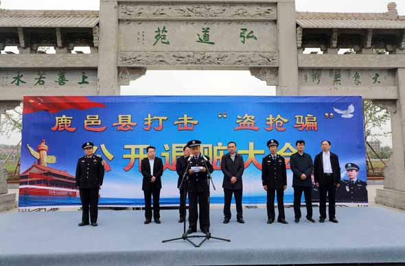 4月25日上午,鹿邑縣召開打擊“盜搶騙”專項行動公開退贓大會??h委常委、政法委書記侯自峰出席會議并講話。縣公、檢、法、司等有關(guān)部門負(fù)責(zé)人與群眾代表近300人參加退贓大會。