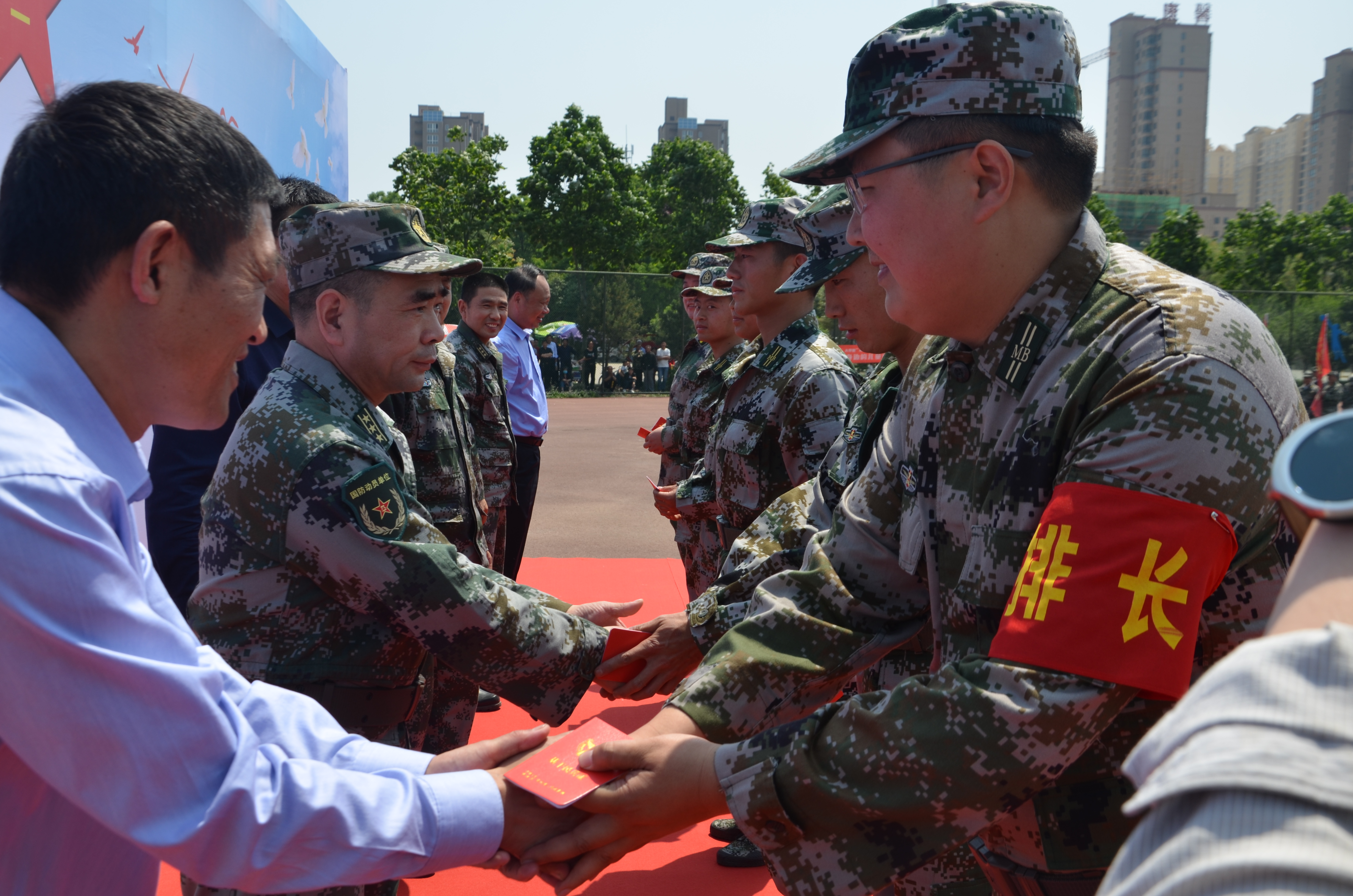 大會(huì)在雄壯的《解放軍軍歌》中拉開了序幕??h委常委、人武部政委曹新旺宣布基干民兵排以上干部任職命令,縣委常委、常務(wù)副縣長郝四春代表縣委、縣政府、縣人武部為基干民兵分隊(duì)授旗,綜合應(yīng)急連指導(dǎo)員、縣人武部政工科長李紅藝帶領(lǐng)全體民兵面對(duì)國旗宣讀民兵誓詞。在場(chǎng)領(lǐng)導(dǎo)向民兵代表發(fā)放了基干民兵證和入隊(duì)通知書,民兵代表和教練員代表分別進(jìn)行了表態(tài)發(fā)言。
