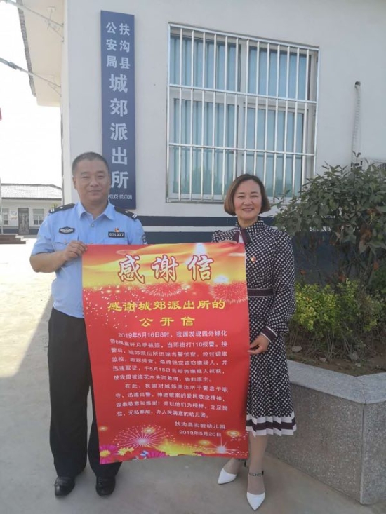 5月20日上午,扶溝縣實驗幼兒園把一封感謝信送到城郊派出所民警手中,表達對該所民警迅速出警,快速辦案的敬意和謝意。