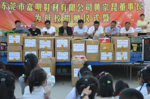 當(dāng)日下午,廣東東莞富明鞋材有限公司董事長黃宗昆為母校薛廟小學(xué)師生捐贈愛心運動鞋儀式在馬頭鎮(zhèn)薛廟小學(xué)舉行。馬頭鎮(zhèn)中心校副校長李永長、中心校辦公室主任章紅勝、薛廟行政村黨支部書記黃志華等村兩委領(lǐng)導(dǎo)、校長黃景思、名譽(yù)校長孫道紅、全校260 多名師生及部分學(xué)生家長600多人參加了當(dāng)天的捐贈儀式。