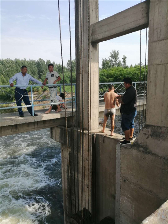 黃興龍邊大聲對青年男子說“堅持住,我去拿工具”,邊向100多米外的閘管所跑去。參加過縣水利局預防未成年人溺亡培訓學習的所長劉浩和職工魏全心、王相等聽到喊聲,立即從辦公室拿來繩索、長竹竿等救援設備,和黃興龍一起跑向出事地點。