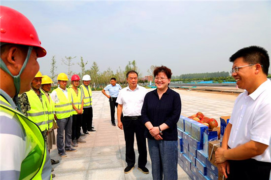 7月16日,扶溝縣長張穎波來到鄭合高鐵(扶溝段)基礎(chǔ)設(shè)施項(xiàng)目現(xiàn)場,為酷暑中仍忙碌在一線的施工人員送來防中暑藥品和西瓜,并實(shí)地督導(dǎo)高鐵路外環(huán)境安全隱患綜合整治等工作。副縣長任松奎和縣住建局、縣水利局、縣高鐵辦主要負(fù)責(zé)人、相關(guān)鄉(xiāng)鎮(zhèn)長參加。
