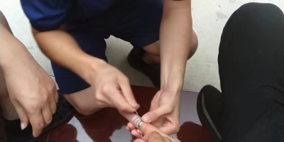 經(jīng)過查看,由于尺寸不合適,該男子左手中指已經(jīng)被戒指卡的出現(xiàn)充血,手指腫脹嚴重。考慮到用剪切器等器械剪戒指可能會傷到手指,指戰(zhàn)員利用纏線解線的方法,用細線穿過戒指在手指上纏繞,然后慢慢拉線,利用細線的滑潤效果幫助取下戒指,很快戒指被成功取下。