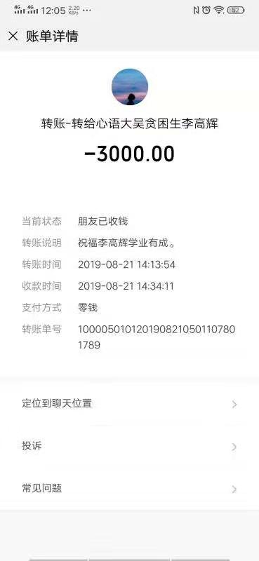 “今后,在學(xué)習(xí)和生活上無論遇到什么困難,只管給我們說,我們會(huì)隨時(shí)幫助你解決。”張新靜在與李高輝聊天中再三叮囑李高輝說。隨后,他通過微信給李高輝轉(zhuǎn)來3000元學(xué)費(fèi)。