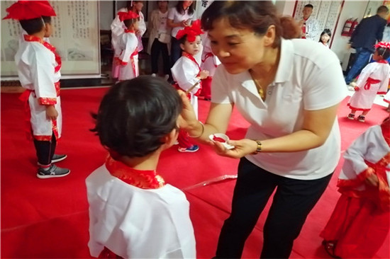 活動(dòng)包含“朱砂開智”、誦讀《弟子規(guī)》、“擊鼓明志”、書畫展示、感恩五個(gè)環(huán)節(jié):第一個(gè)環(huán)節(jié)老師為孩子“朱砂開智”。用朱砂為剛剛?cè)雽W(xué)的孩子在額頭正中點(diǎn)上紅痣,又稱之為“開天眼”。寓意著孩子從此心明眼亮,好讀書、讀好書。第二個(gè)環(huán)節(jié)老師帶領(lǐng)大家誦讀《弟子規(guī)》。孩子們?cè)诶蠋熂吧鐓^(qū)工作人員帶領(lǐng)下誦讀國(guó)學(xué)經(jīng)典《弟子規(guī)》,一起感受儒家經(jīng)典的道德教化魅力。第三個(gè)環(huán)節(jié)是“擊鼓明志”。擊鼓明志是結(jié)合中國(guó)傳統(tǒng)文化,讓孩子們通過擊打中國(guó)鼓,以鼓聲的清脆悅耳,來提高孩子的精氣神,激發(fā)孩子們的斗志,給孩子們建立濟(jì)世救人,胸懷天下的抱負(fù),從而也讓孩子們表達(dá)出人生理想,為未來的人生目標(biāo)努力奮斗。“我長(zhǎng)大想當(dāng)一名醫(yī)生,可以治病救人……我長(zhǎng)大想當(dāng)一名消防員,在著火的時(shí)候奔赴火場(chǎng)救人……我長(zhǎng)大想當(dāng)一名古箏老師,登上世界舞臺(tái)彈奏好聽的音樂……”孩子們依次擊鼓并說出了人生理想抱負(fù)。第四個(gè)環(huán)節(jié)是書畫展示。繪畫創(chuàng)作讓孩子們靜定心靈,激發(fā)智慧。第五個(gè)環(huán)節(jié)是感恩環(huán)節(jié),感恩老師、感恩父母、感恩天地萬物,以此培養(yǎng)孩子們向善向上的健康思想,增強(qiáng)他們的社會(huì)責(zé)任感,進(jìn)一步引導(dǎo)他們常懷感恩之心。