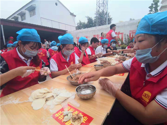 與此同時(shí),在演出現(xiàn)場(chǎng)附近的村委大院內(nèi),由周口市慈孝文化促進(jìn)會(huì)、北斗達(dá)教育集團(tuán)等組成的200多名志愿團(tuán)隊(duì)正忙得不亦樂(lè)乎,調(diào)餡、包餃子、下鍋、端盤(pán),兩個(gè)多小時(shí)內(nèi),他們精心包出20000多個(gè)愛(ài)心水餃。11時(shí)30分,餃子宴正式開(kāi)始,老人們一邊吃著水餃一邊觀看者演出,喜笑顏開(kāi),呈現(xiàn)出一片相親相敬的溫馨畫(huà)面。