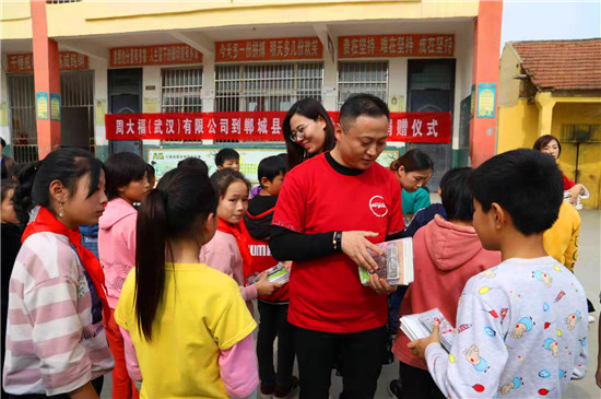 10月24日,周大福河南區(qū)域負(fù)責(zé)人岳磊一行15人,帶著書包、文具、足球、藍(lán)球等學(xué)習(xí)用品,來(lái)到鄲城縣丁村鄉(xiāng)徐莊小學(xué),為200余名學(xué)生送來(lái)了愛心大禮包。并為兩戶貧困戶送去了米面油等慰問品。