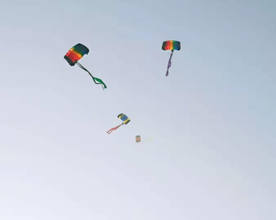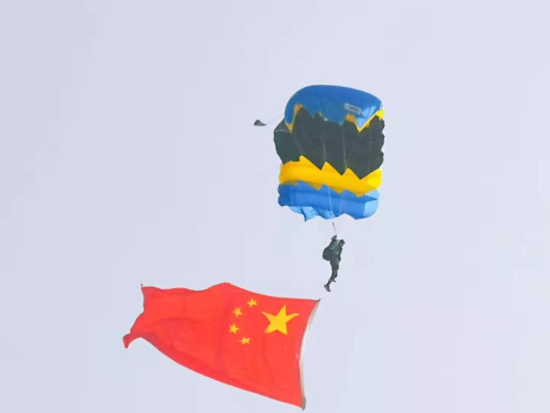 “看,跳傘表演開始了?!?0月29日上午,周口西華通用機(jī)場首航儀式結(jié)束后,一場精彩絕倫的飛行表演就開始了。載著跳傘運(yùn)動(dòng)員的飛機(jī)起飛到指定地點(diǎn)后,運(yùn)動(dòng)員攜帶著國旗和彩帶從高空中跳下,打開傘包后,空中五顏六色十分漂亮,引得圍觀群眾不時(shí)叫好。