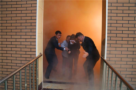 記者在現(xiàn)場看到,隨著消防警鈴的響起、煙霧的彌漫,來自物業(yè)公司和社區(qū)的數(shù)十名群眾彎著腰,同時用濕毛巾捂著口鼻,緊急而有序地從步梯撤出,與此同時,消防隊員迅速將消防水袋和槍頭同消防栓相連接,并打開消防栓對準(zhǔn)“火勢”,一瞬間,發(fā)生在建業(yè)社區(qū)的一場“火災(zāi)”被及時撲滅,現(xiàn)場圍觀的眾人爆發(fā)出陣陣掌聲。