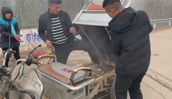 “當(dāng)時(shí)在我們前方的一輛電動(dòng)三輪車駕駛座下冒出黑煙,車上兩位老人察覺到危險(xiǎn)后,急忙下車,站在一旁不知所措。我們也緊跟上前。事發(fā)突然,現(xiàn)場(chǎng)沒有滅火器和可利用水源,而三輪車的火越來越大,兩位老人著急萬(wàn)分,在旁邊不停地請(qǐng)求我們幫幫她們。根據(jù)經(jīng)驗(yàn),我們當(dāng)機(jī)立斷利用路邊的泥土進(jìn)行撲救,經(jīng)過幾十秒的緊張撲救,著火部位被成功撲滅?!比幌狸?duì)員回憶說三輪車是電線短路引起的電瓶著火。