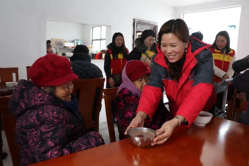 “開飯嘍!”中午時(shí)分,志愿者們將老人一一攙扶到餐廳坐下,隨后將一碗碗香氣四溢、且冒著熱氣的八寶粥端到老人跟前?!跋?,真香!”80歲的黃柏功老人舀了一勺八寶粥放到嘴里品了品笑著說(shuō)。吃著八寶粥,老人想起了以前的艱苦生活,他禁不住激動(dòng)地哭了起來(lái):“以前,吃了上頓沒下頓,想吃一塊白面饃,都得等到過(guò)年??涩F(xiàn)在,天天不斷肉,生活越來(lái)越好。這都是共產(chǎn)黨給咱的福啊。”