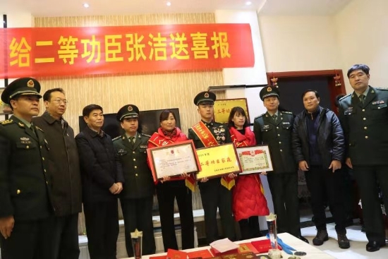 當(dāng)日上午,張潔的老家鑼鼓喧天,熱鬧非常。軍地領(lǐng)導(dǎo)在鄉(xiāng)親們熱烈地掌聲和鑼鼓聲中,帶著滿滿地祝福,專程趕到張潔家中。“張潔同志,在國(guó)際軍事比武競(jìng)賽中取得第一名,榮立二等功為此特向您報(bào)喜。希望您今后多與部隊(duì)聯(lián)系,多給予張潔同志鼓勵(lì),為實(shí)現(xiàn)中華民族偉大復(fù)興的強(qiáng)國(guó)夢(mèng)、強(qiáng)軍夢(mèng)共同奮斗?!痹趶垵嵓抑校?9246部隊(duì)副政委楊富鵬代表組織宣讀了部隊(duì)賀信。