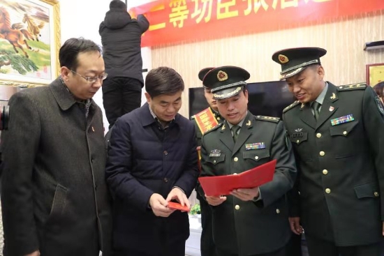 隨后,周口軍分區(qū)政治部主任李揚(yáng),太康縣委副書記、政法委書記劉海艇,縣委常委、副縣長(zhǎng)韓維俊,縣委常委、人武部部長(zhǎng)于永前,人武部政委郭立君等領(lǐng)導(dǎo)給張潔的母親盧靈芝送去了立功喜報(bào)、二等功臣家庭牌匾和慰問(wèn)品、慰問(wèn)金。
