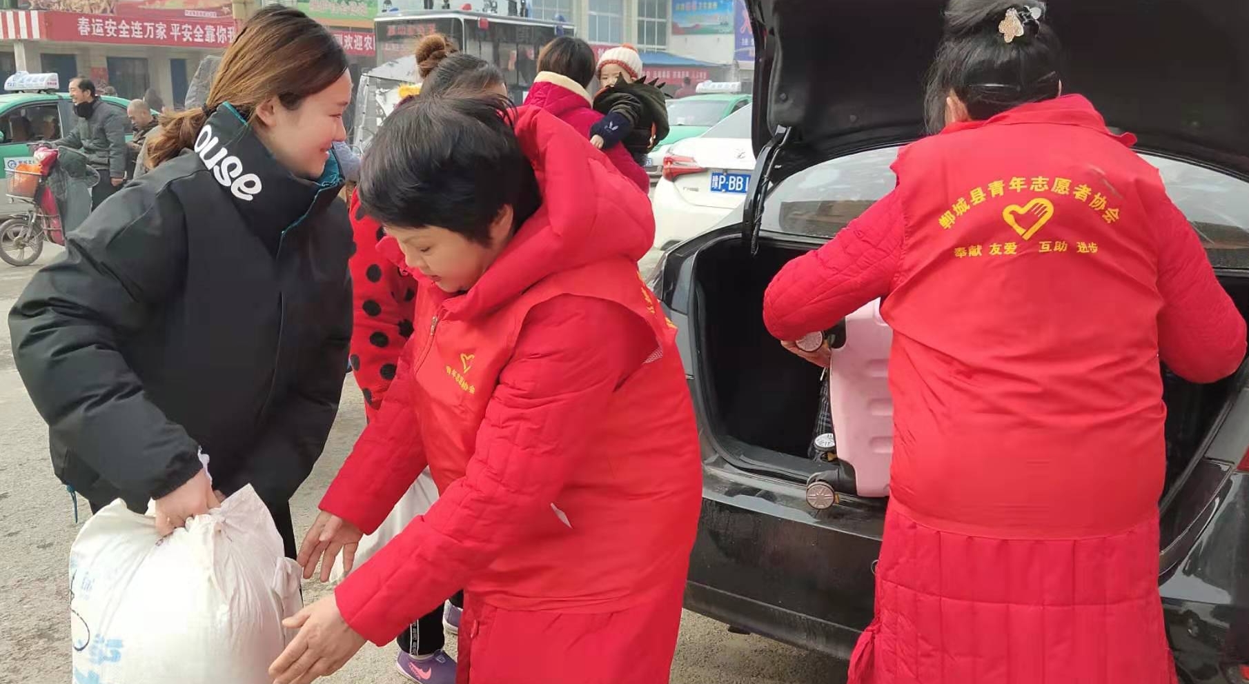 1月13日,寒意襲人,在鄲城汽車站30多名志愿在車站門外忙著給上、下車的老鄉(xiāng)推拉箱、拿行李,一句“歡迎老鄉(xiāng)回家過年”溫暖著旅客們的心。