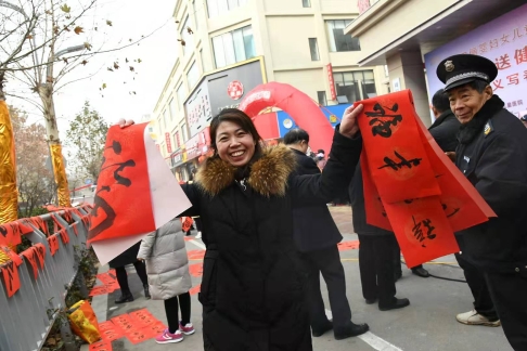 18日上午9時(shí)30分,位于新建街的周口儷嬰婦女兒童醫(yī)院門(mén)前喜氣洋洋,張燈結(jié)彩,熱鬧非凡,儷嬰婦女兒童醫(yī)院邀請(qǐng)市書(shū)協(xié)、川匯區(qū)書(shū)協(xié)的書(shū)法家們,在門(mén)前為“送福送健康暨書(shū)法家義寫(xiě)春聯(lián)”活動(dòng)舉行了簡(jiǎn)短的儀式,隨即活動(dòng)展開(kāi),一邊是儷嬰婦女兒童醫(yī)院的專(zhuān)家們將坐診臺(tái)搬到門(mén)前,細(xì)致地為來(lái)往的居民免費(fèi)量血壓、把脈等義診,一邊擺下10多張桌子和筆墨紙硯,中國(guó)書(shū)協(xié)會(huì)員游保峰,著名書(shū)法家、川匯區(qū)書(shū)協(xié)終身名譽(yù)主席李大慶,書(shū)法家馮干敏、李輝、李國(guó)斌及川匯區(qū)書(shū)協(xié)主席李尊杰,市書(shū)協(xié)副主席劉廣巖,川匯區(qū)書(shū)協(xié)副主席兼秘書(shū)長(zhǎng)杜忠義,副主席曾祥峰、何楠,著名書(shū)法家寇成義等書(shū)法家們,展開(kāi)大紅的紙張,揮毫潑墨,飄著墨香的福字和一對(duì)對(duì)大紅的春聯(lián),帶著新春的祝福,送到居民手里,一波波居民到自己喜愛(ài)的書(shū)法家面前,喜討福字和春聯(lián),開(kāi)心的喜悅洋溢著臉上……